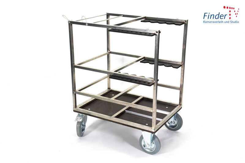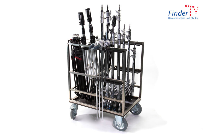 Mit dem Lichtstativwagen von Abels sind C-Stands und weitere Lichtstative gut sortiert, leicht zu transportieren und immer dort wo man sie braucht.